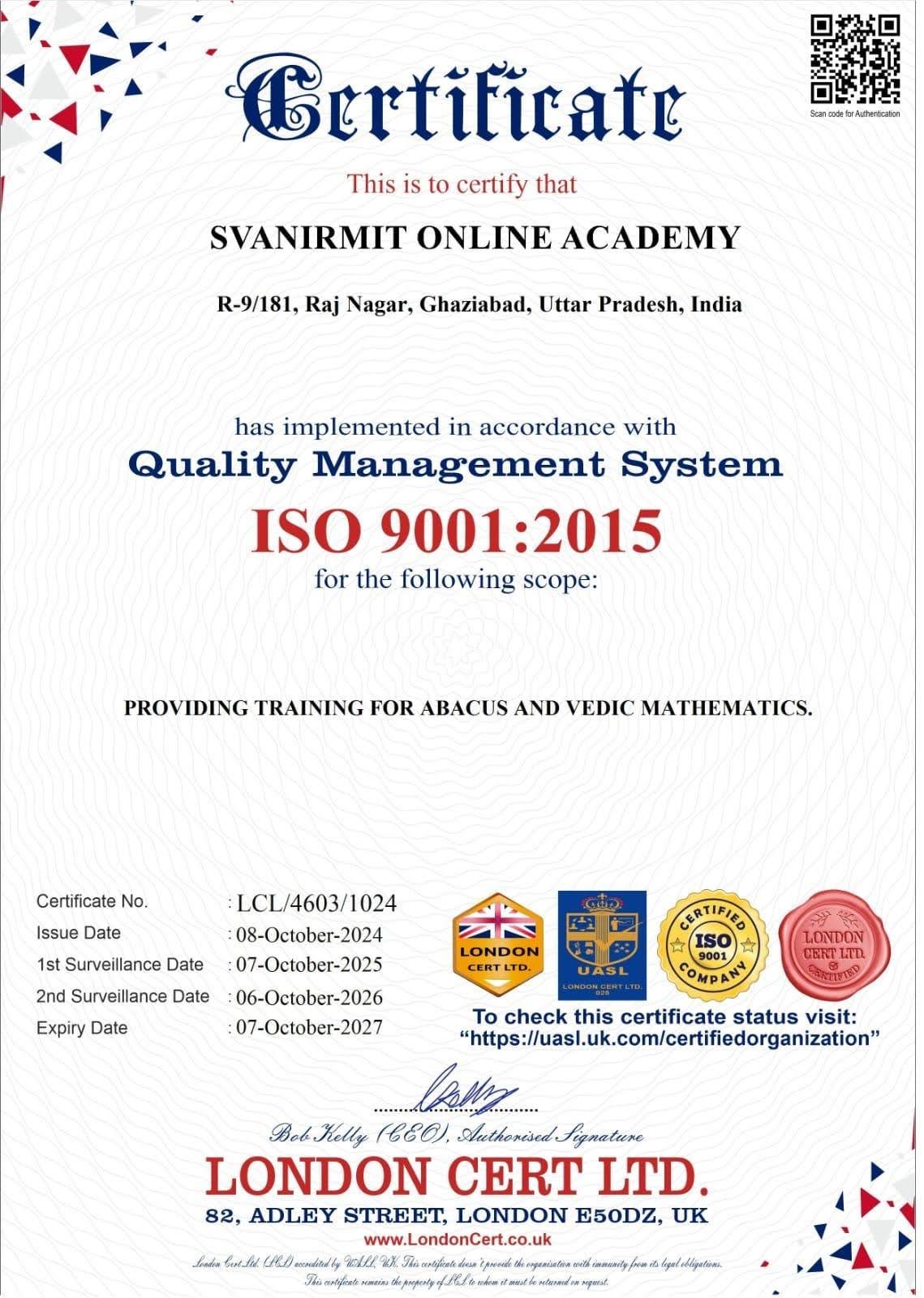 Svanirmit Online Academy is officially certified under the Quality Management System ISO 9001:2015 for providing training in Abacus and Vedic Mathematics.